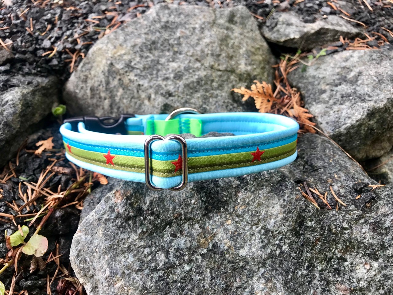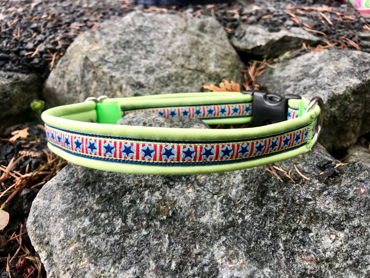 Das Gurtband ist reißfest und der Steckschließer besteht aus robusten Acetal, somit ist das Hundehalsband auch für größere Zugbelastungen geeignet. Der D-Ring ist komplett geschlossen und besteht aus verzinktem Stahl. Alle Nähte sind mit Qualitätsnähgarn ausgeführt, die belasteten Nähte bestehen aus 8-10 parallel geführten Stichen. Der Baumwollstoff wurde vor dem Verarbeiten gewaschen, läuft also nicht mehr ein oder färbt aus. Er wurde außerdem mit einem Applikationsvlies verstärkt.