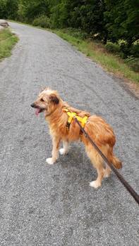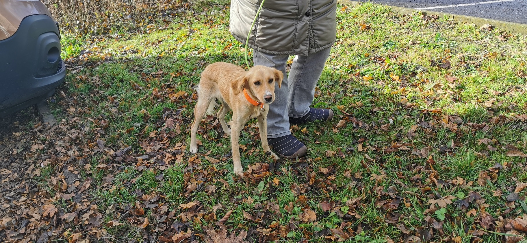 geht gut an der Leine, fährt gut im Auto mit. kommt aus einem Animal Hording