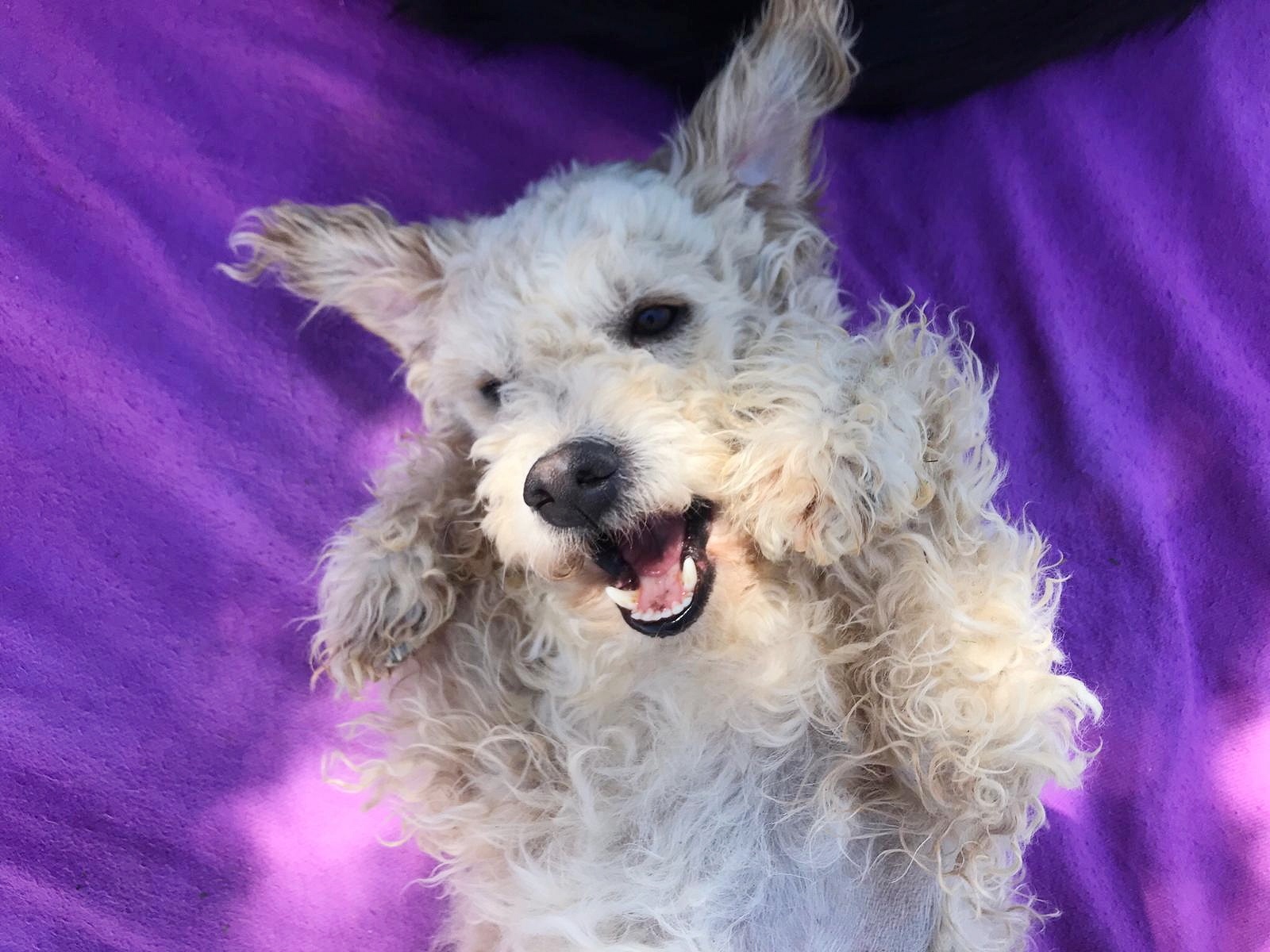 Völlig entspannt genießt er die Kuscheleien und schaut einem dann so lieb in die Augen. Da er keine bevorzugten Schmusestellen hat (falsch ausgedrückt: dieser Hund besteht nur aus Schmusestellen), genießt er die Zuwendung, wie ich es bisher kaum erlebt habe.